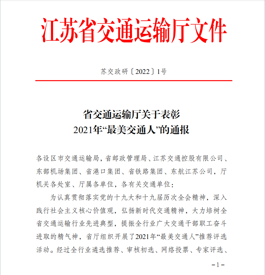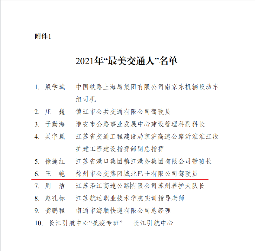 近日,江蘇省交通運(yùn)輸廳下發(fā)《省交通運(yùn)輸廳關(guān)于表彰2021年“最美交通人”的通報(bào)》,徐州公交集團(tuán)公交車駕駛員王艷榮獲“最美交通人”稱號(hào)。