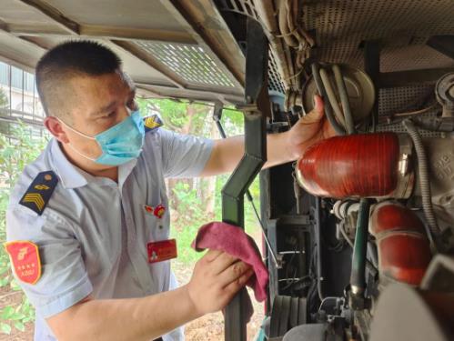 早上6時(shí),順通公司57路129車(chē)駕駛員律桐波來(lái)到奔騰公交首末站,開(kāi)始發(fā)車(chē)前的準(zhǔn)備工作。律桐波先將隨身攜帶的1000毫升大水杯放在了駕駛室,隨后,他按要求逐一檢查了滅火器、逃生錘、輪胎等安全部位,并對(duì)車(chē)廂進(jìn)行消毒。