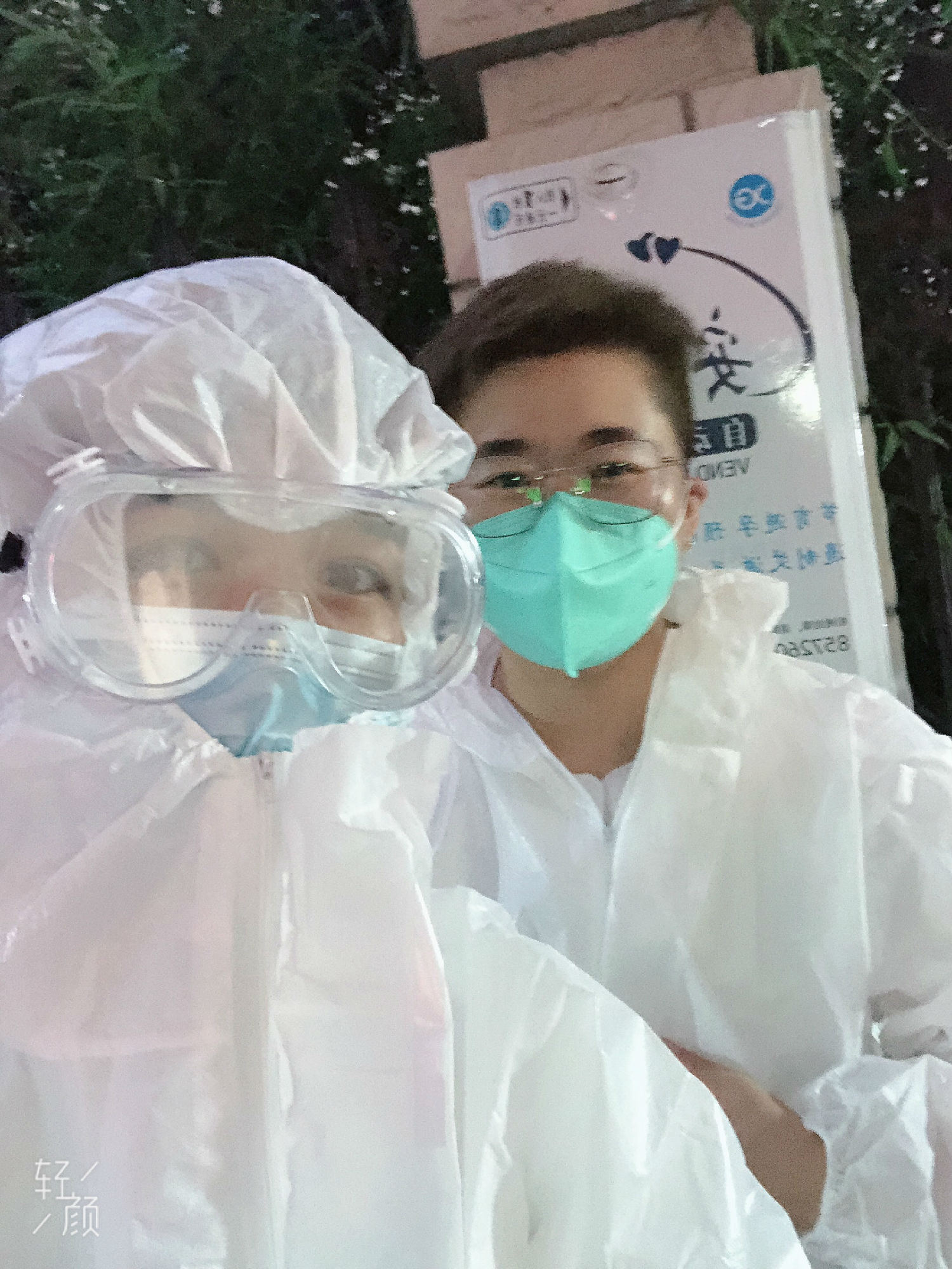 “請大家不要著急,排好隊、戴好口罩,保持一米距離。”身穿防護服的她們高聲引導(dǎo)。短短兩天時間她們親身體驗到了醫(yī)護人員的辛苦。“這是我們倆第一次穿上防護服,和之前電視里看到一樣,脫下防護服后皮膚上有深深的勒痕,但是穿上的那一刻就感到責任重大!”兩個年輕人“苦中作樂”用照片記錄下自己這段特殊的經(jīng)歷。