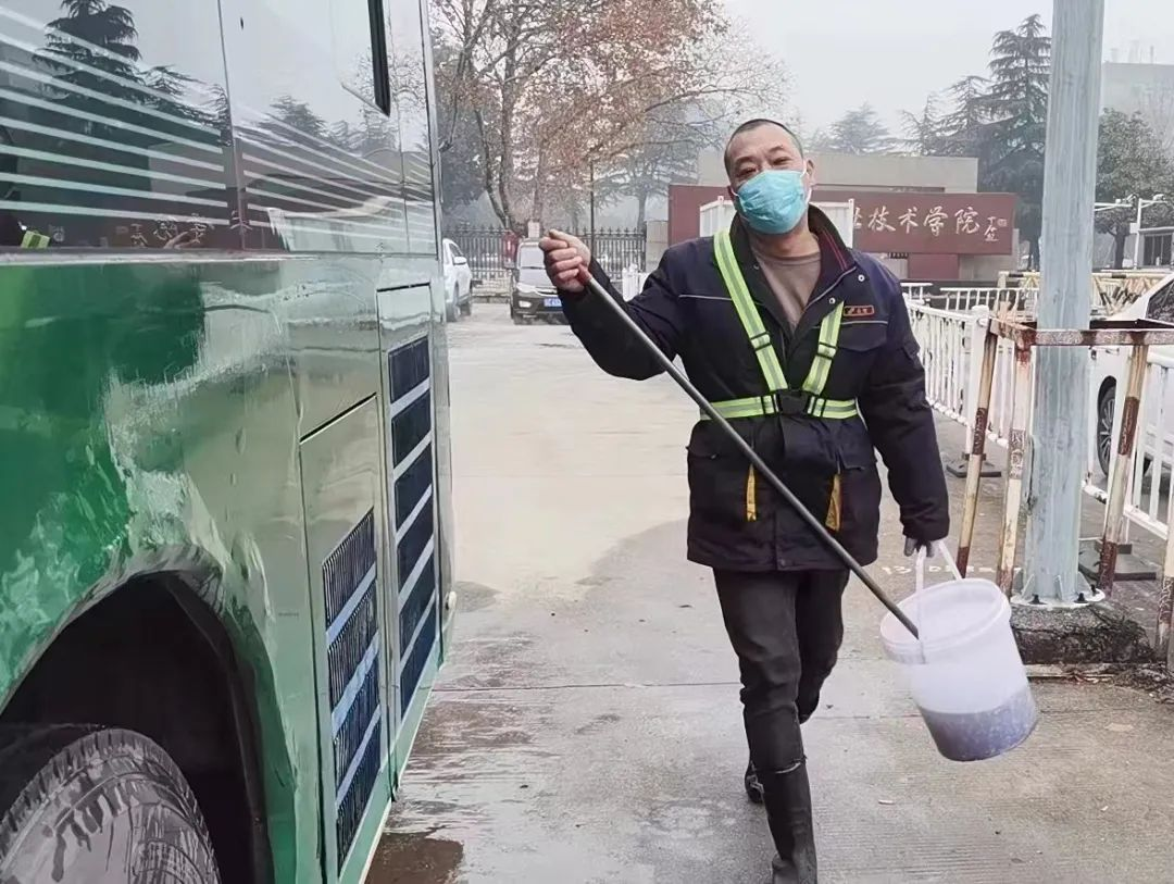 春運(yùn)期間,為保障廣大市民乘客出行需求,部分公交線路縮短了發(fā)車時(shí)間,增加了運(yùn)營車輛,再加上客流增多,路面擁堵等情況,公交車回到終點(diǎn)站停放的時(shí)間很短,又要投入到下一趟的運(yùn)營當(dāng)中,這無疑給車輛保潔工作帶來了一定的困難。因此,為確保出場車輛干凈整潔,每天天沒亮,張璞已經(jīng)在建筑學(xué)院停車場里忙起來了。只見他一手拿毛刷,一手拎水桶,開始清潔車廂外部,張璞動作嫻熟地擦拭前擋風(fēng)玻璃、車廂外部兩側(cè),不一會,他的臉上就已掛滿了汗珠,平均一輛車10分鐘的清潔時(shí)間,是他十多年工作鍛煉出來的速度。近日氣溫驟降,持續(xù)有冰凍天氣,如果抹布太濕,早晨擦座椅時(shí)會粘在上面,為此張璞都會提前準(zhǔn)備好潮濕的抹布,既能擦掉扶手、座椅、靠背上的浮塵,還不會留下水漬。像這樣日復(fù)一日的簡單工作,張璞堅(jiān)持了十多年,他平均每天要打掃23臺車,平均一輛車10分鐘的清潔時(shí)間,張璞用自己的勞動,換來了車輛的干凈整潔。
